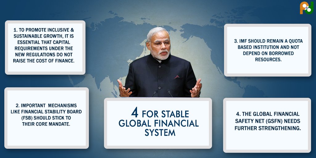 Addressing the world leaders on the day 2 of the Summit, the Prime Minister highlighted why a stable global economic and financial system is absolutely imperative for growth. He remarked that long-delayed 15th general review of quotas must be completed by 2017 annual meetings. Calling for efforts for zero tolerance for corruption & black money; zero administrative policy & treaty loopholes; zero barriers & full commitment to action, he said, “Fighting corruption, black money & tax evasion were central to effective financial governance".