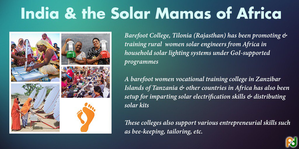 Barefoot College, Tilonia (Rajasthan) has been promoting and training rural women solar engineers (solar mamas) from Africa in fabrication, installation, use, repair and maintenance of solar lanterns and household solar lighting under Government of India supported programmes. They have set up a Barefoot women vocational training college in Zanzibar Islands of Tanzania and other countries in Africa for imparting solar electrification skills (training) and distributing solar kits to trainees. These colleges also support various entrepreneurial skills such as bee-keeping, tailoring, etc. The solar mamas have fabricated and installed solar kits, and now maintain these solar electrification systems in their communities.